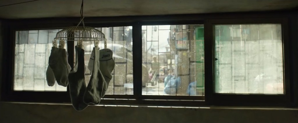 La metáfora más vívida comienza en la primera toma, el semisótano de cualquier barrio pobre de Corea es fumigado por la sanidad pública, orinado por el vagabundo del barrio, habitado por una hacinada familia Taek sin el preciado internet. Sobre-viven día con día, Ki-Taek padre (súper interpretado por Song Kang-ho -en un papel también posiblemente consecuente del general norcoreano Oh Kyeong-pil en busca de venganza en Área común de seguridad (2000)- y esposo de Chung-sook (Jang Hye-jin) ex-medallista en lanzamiento de martillo, con sus hijos Ki-jung y Ki-woo, jovenes rezagados de una educación de difícil acceso cuando no exclusiva para las clases medias y altas.